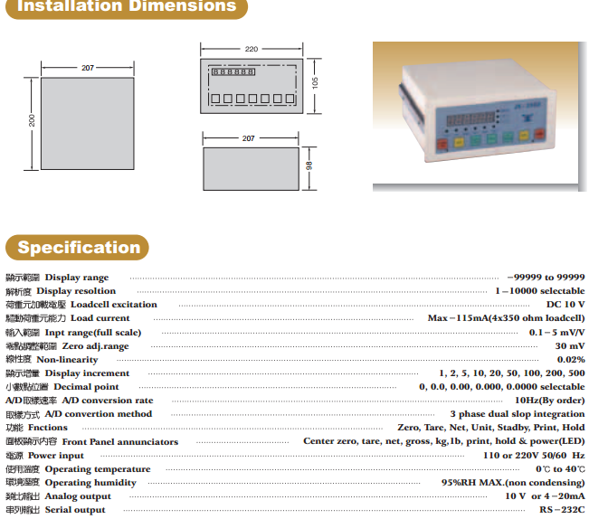 臺灣JIHSENSE JS-320稱重顯示控制器可標(biāo)配本品牌所有模擬荷重元規(guī)格: